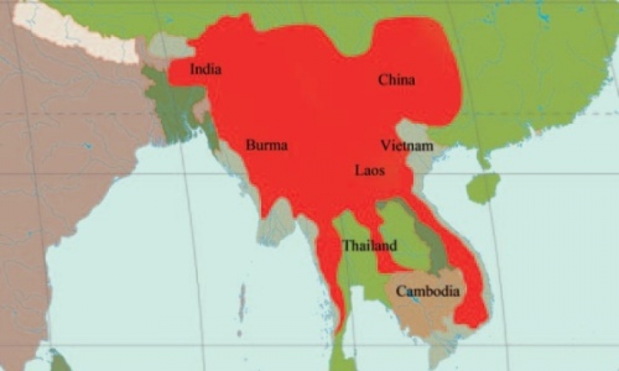 Hình 1: Miền Zomia như được tưởng kiến bởi James C. Scott. Miền này, ở đây được tô màu đỏ, bao gồm các phần đất cao hơn 300 mét tại Ấn Độ, Miến Điện, Trung Hoa, Thái Lan, Lào, Căm Bốt và Việt Nam. Cho đến giữa thế kỷ thứ hai mươi, theo tác giả Scott, nó là một miền ẩn náu và lẩn tránh nhà nước từ khu vực cốt lõi tại các miền đất thấp. Trích dẫn từ James C. Scott, Art of Not Being Governed: An Anarchist History of Upland Southeast Asia (New Haven: Yale University Press, 2010), 17 (bản vẽ tô màu bởi David Fohn).