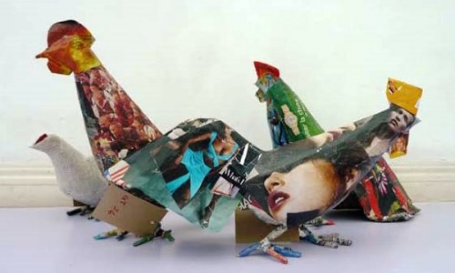Tính pop art thể hiện rõ nét ở cách sử dụng giấy báo với hình ảnh các nhân vật nổi tiếng như diễn viên điện ảnh, ca sĩ, chính trị gia, gắn với các sự kiện xã hội khi tạo hình những chú gà trống. Các tạp chí được sử dụng ở đây rất phong phú, từ tạp chí thời trang, du lịch đến điện ảnh… So với gà mái, những anh gà trống diêm dúa hơn khi được bồi, bọc bằng tạp chí màu sắc rực rỡ. Có chú gà trống được bọc nguyên một trang tạp chí in hình ảnh lễ trao giải thưởng điện ảnh Oscar năm 2003 cho phim Lord of the Ring, những chú khác được bọc bằng cả một khuôn mặt của một minh tinh điện ảnh hay người mẫu nổi tiếng nào đó…