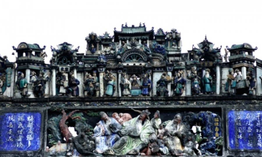 Nghệ thuật tượng gốm tập trung trên mái ngói của 19 gian nhà lớn, dùng điêu khắc gạch ở phía đông, đối diện phía tây có bức tường ngoài với quy mô rộng lớn. Tượng gốm trên mái ngói của hành lang là tác phẩm điêu khắc thạch cao do nghệ nhân Nam Hải chế tác. Ngoài bình phong, khung xà và cửa lớn của Tụ hiền đường đều được chạm khắc bằng gỗ, sau điện thờ có 11 đôi ghế được chạm khắc một kiểu thống nhất với các họa tiết trùng trùng điệp điệp, kiểu dáng đồ sộ, có khắc ghi Quang Tự năm thứ 16.