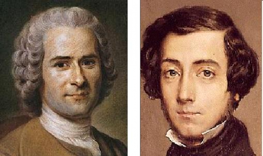 Trong khi Rousseau cho rằng, bình đẳng là tiền đề của tự do và có thể bảo vệ được tự do thì Tocqueville lại thiên về quan điểm: bình đẳng có thể làm tổn hại tới tự do và do vậy, cần phải có những thiết chế tự do để bảo vệ chính tự do. Những thiết chế tự do này biểu hiện và liên quan chặt chẽ tới các quyền cơ bản của con người. Như vậy, rõ ràng là Tocqueville đã kế thừa một số tư tưởng cơ bản của Rousseau về tự do, nhưng ông đã sớm nhận thấy rõ nguy cơ chuyên quyền, độc đoán, lạm dụng quyền lực của phe đa số trong nền dân trị Mỹ - điều mà trước đây, Rousseaeu đã không thể nhận thấy.