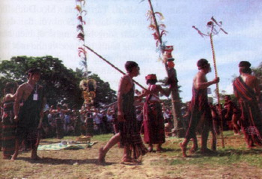 - Trong khi mổ trâu, dê là lúc mọi người phân tán về các địa điểm quy định để ăn uống, vui chơi ca hát và chuẩn bị cho một cuộc lễ tại cây nêu chính. Cuộc lễ này bao gồm 9 già làng cùng tham gia tế lễ tập thể. Lễ vật gồm 7 mâm, có thêm đầu trâu sống nguyên sừng, chân trâu sống, đầu dê sống và các món ăn cổ truyền được đồng bào ưa thích như: lòng trâu, lợn, lạp[12], chuột nướng ống, cá nướng ống, cà lèng[13]... Một cây nêu nhỏ, ngọn chia 3 nhánh ở giữa tạo thành hạt lúa cách điệu, bên trong đựng một ít lễ vật” bát xôi, 3 con cá nướng... được cắm thêm bên cây nêu chính. Đội múa, nhạc tiếp tục múa vòng quanh sân. 9 già làng cùng khấn tập thể, dùng Axom vẫy nước, rượu vào cây nêu, nọc trâu và ném Axom mắc lên cây nêu chính, gieo Asiêu để xin keo... và cùng tất cả hô hú. Khi hô thì ngước mặt lên (Trời), hú thì cúi mặt xuống (Đất) như biểu lộ sự biết ơn Trời - Đất. Sau khi ném hết Axom, 9 già làng tách thành 2 nhóm, một đi về phía sông suối, một đi về hướng núi rừng (đại diện hướng của Yang Đak, Yang Koeoh) có tốp nhạc đi theo phụ họa và hô hú để thực hiện nghi thức tiễn các Thần về nơi ngự trị của mình. Cúng xong ăn uống tại chỗ mới trở lại sân chung.