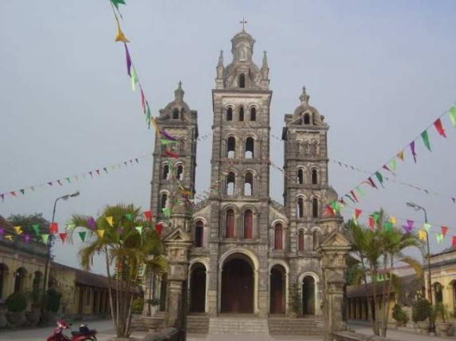 - Nhà thờ Lớn (hay còn gọi là nhà thờ Kính Đức Mẹ Mân Côi). Đây là ngôi nhà thờ lớn nhất, đẹp nhất và lối kiến trúc dân tộc cũng được thể hiện rõ nét nhất. Mặt tiền của nhà thờ Lớn có 5 lối ra vào bằng đá, phía trên là ba tháp vuông bằng gạch, đầu đao, mái cong, lợp ngói mũi hài. Trên đỉnh tháp ở giữa có tượng hai thiên thần cầm thánh giá, hai bên là hai thiên thần khác thổi loa, bên dưới có khắc 4 chữ Hán “Thẩm phán tiền triệu” (điềm báo trước ngày phán xét). Điều đáng nói là các thiên thần này đều mang gương mặt Á Đông, hai tai dài, dái tai chẩy như tai Phật.