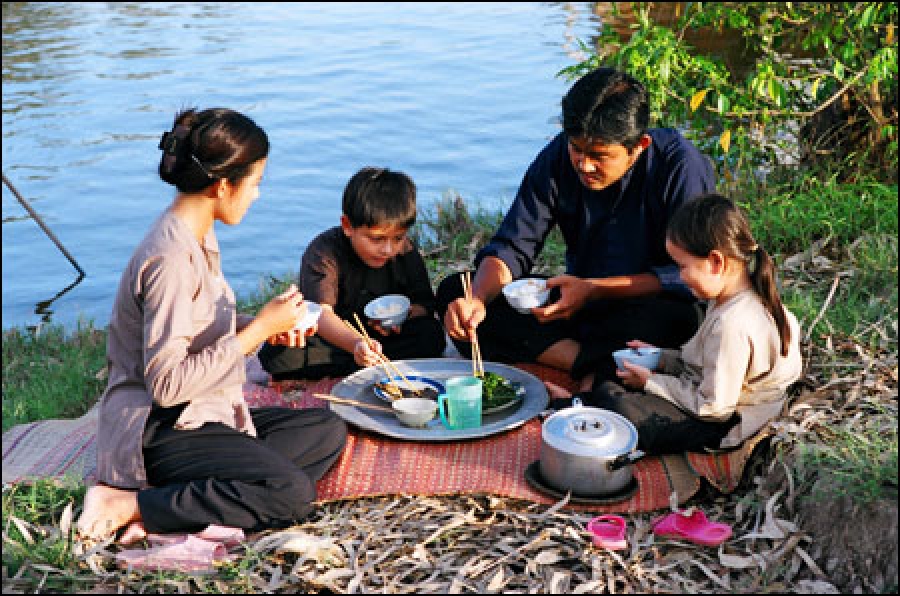- Hồi trước1945, nhiều gia đình khá giả còn duy trì kiểu lót chiếu, ngồi ăn trên đất, có lẽ theo ảnh hưởng người Chàm. Kiểu ăn trên bộ ván, ngồi xếp bằng như chẳng còn thấy ở gia đình trung lưu miền quê. Ngồi trên bộ ván thì phải theo tư thế xếp bằng, quen thói nên khi ngồi trên ghế dễ mỏi chân. Vả lại, bộ ván ngày nay mắc tiền, divan thì quá nhỏ hẹp.