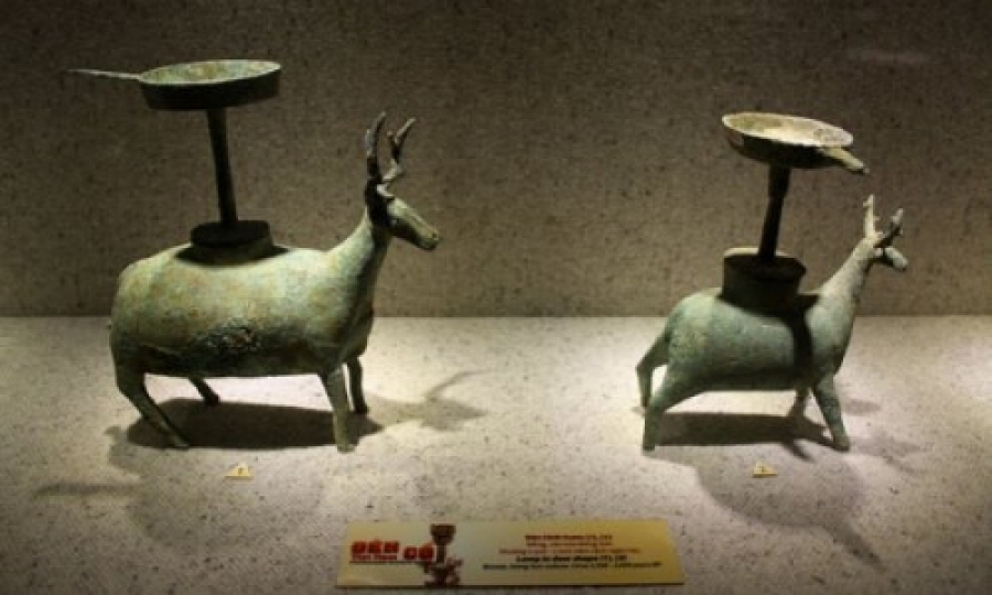 4. Đèn đồng dài 35cm, niên đại khoảng từ TK I trước CN - TK III, tìm được ở Việt Nam, ký hiệu P162 được giới thiệu trên Hioco Galerie chuyên doanh nghệ thuật châu Á. Nguồn: www.galeriehioco.com.