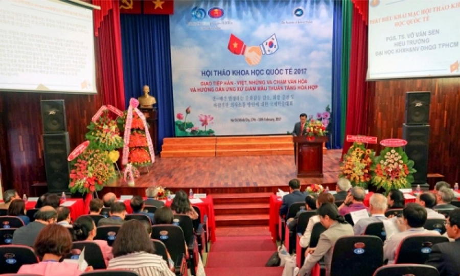 Thay mặt BGH nhà trường, PGS.TS. Võ Văn Sen đã đọc diễn văn khai mạc hội thảo. PGS.TS. Võ Văn Sen nhấn mạnh đến mối quan hệ chính thức của Việt Nam và Hàn Quốc bước sang năm thứ 25, từ đối tác thông thường được nâng lên thành đối tác toàn diện rồi đến đối tác chiến lược từ năm 2009; là mối quan hệ này thể hiện bằng sự phát triển năng động và hiệu quả trong các lĩnh vực chính trị -kinh tế - văn hoá - xã hội, an ninh - quốc phòng, giáo dục và đào tạo, khoa học - công nghệ. Hiện tại có hơn 150.000 công dân của hai bên đến sinh sống, học tập, làm ăn tại hai quốc gia; đồng thời mối quan hệ hôn nhân Việt-Hàn và các thế hệ con cháu đời sau cũng rất lớn, hiện trở thành những nhịp cầu nối quan trọng trong giao lưu văn hóa hai quốc gia. Bên cạnh tính tương đồng vẫn còn nhiều khác biệt mang tính hữu cơ giữa nền văn hoá, ít nhiều có tác động đến sự thúc đẩy giao lưu Việt-Hàn, đòi hỏi giới nghiên cứu của hai bền cần ngồi lại và thảo luận sâu hơn nữa các giải pháp khoa học mang tính khả thi để gia tăng sự thấu hiểu văn hoá và khắc phục những trở ngại của thực tiễn phát triển quan hệ hợp tác song phương. Với bề dày 60 năm hình thành và phát triển, Trường ĐHKHXH&NV-ĐHQG-HCM đã và đang làm chiếc cầu nối văn hoá hữu hiệu cho hai quốc gia, trực tiếp tăng cường sự thấu hiểu văn hoá lẫn nhau bằng cách nghiên cứu và công bố khoa học, phổ biến kiến thức và cung cấp nguồn nhân lực chất lượng cao cho thị trường lao động có yếu tố Hàn Quốc tại Việt Nam. Trước sự thay đổi nhanh chóng của xã hội, nhà trường thành lập Trung tâm nghiên cứu Hàn Quốc học, trở thành địa chỉ đào tạo và nghiên cứu Hàn Quốc có tính toàn diện. Trung tâm tập trung vào nghiên cứu so sánh văn hoá Việt Nam - Hàn Quốc, chỉ ra ưu, khuyết điểm và đề xuất giải pháp có ý nghĩa khoa học và thực tiễn dựa trên việc hiểu biết văn hoá của nhau để thúc đẩy hiệu quả hợp tác giữa hai bên. Các đề tài nghiên cứu đã được nghiệm thu và dự án mới đang được thực hiện chính là nỗ lực của nhà trường cùng với Trung tâm thực hiện nhằm giới thiệu đến các độc giả những kết quả này.